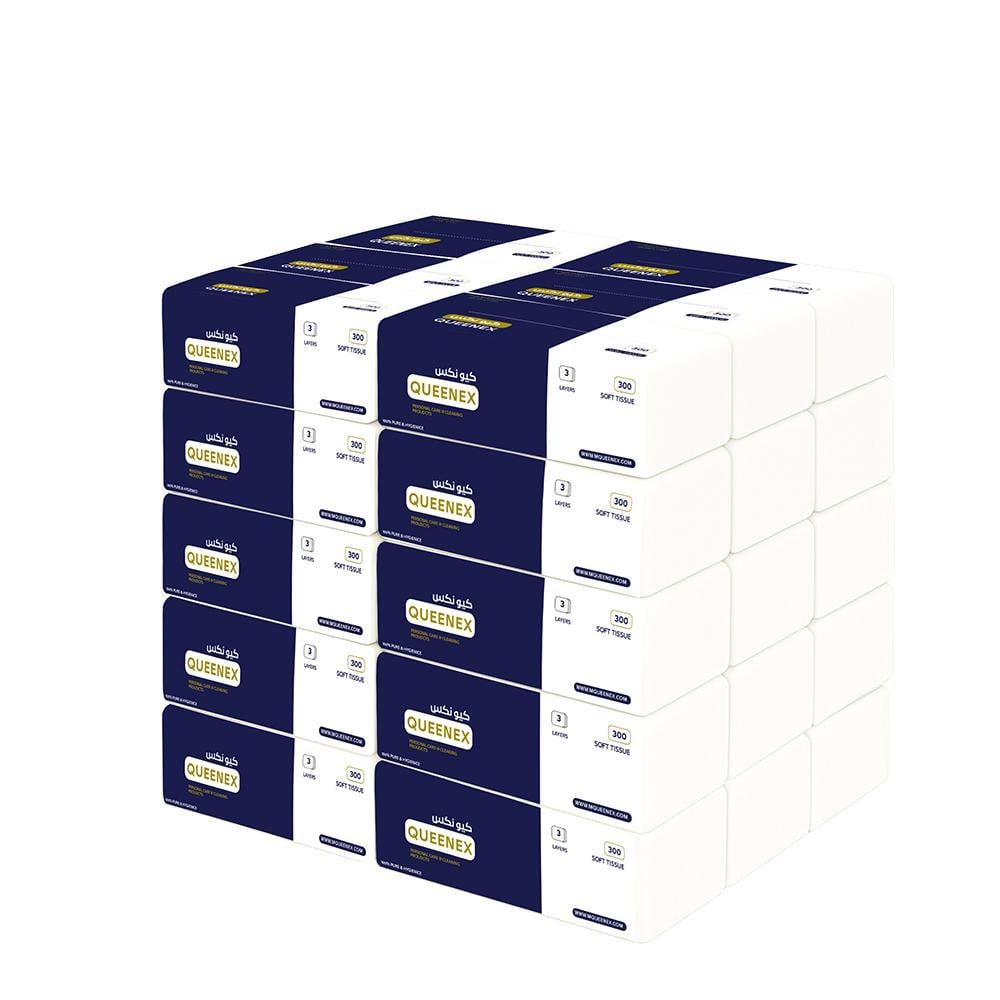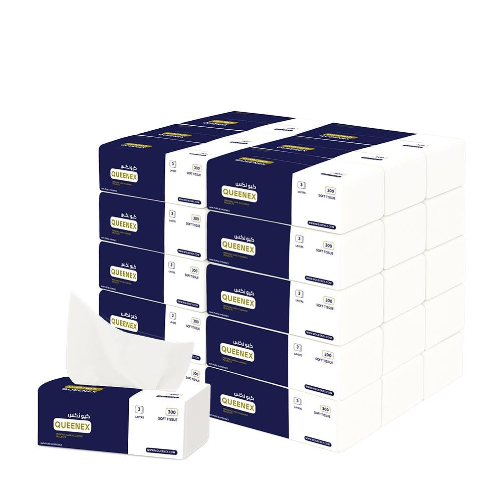 منتج عملي واقتصادي يناسب جميع الاستخدامات اليومية. تحتوي كل علبة على 300 منديل أبيض ناعم بثلاث طبقات، وتأتيك العبوة الكاملة بـ 30 علبة مناسبة للمنازل، المكاتب، المتاجر، والضيافة.